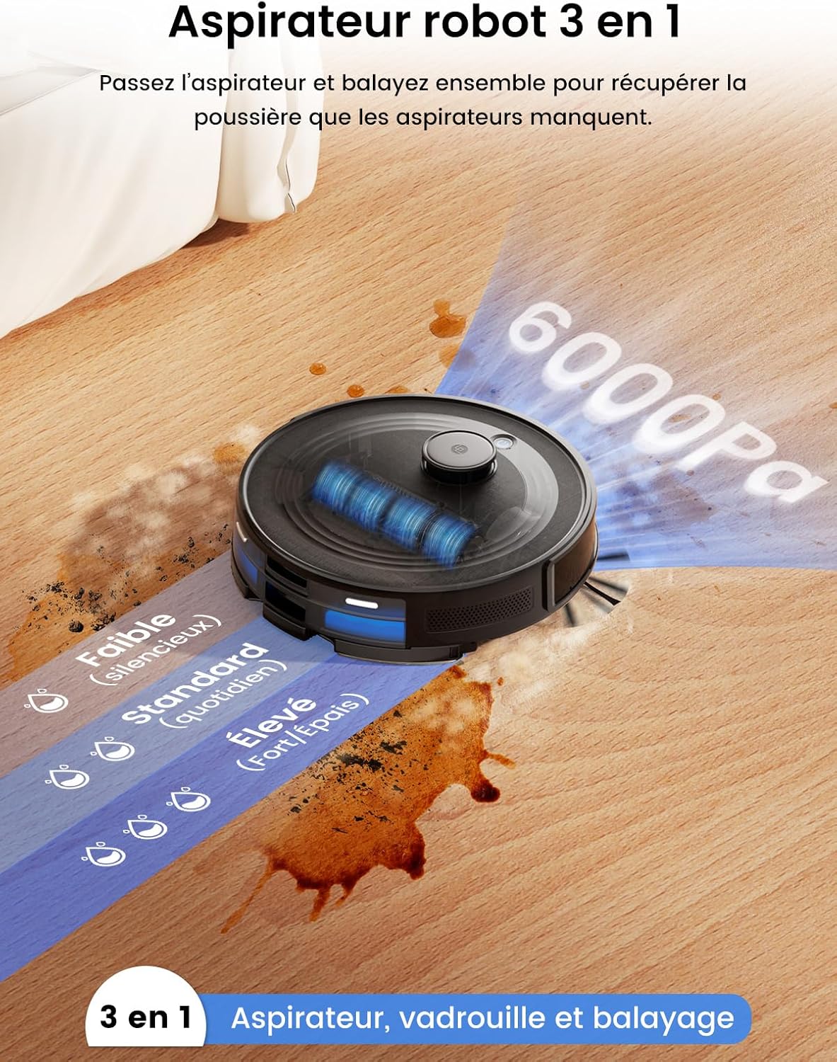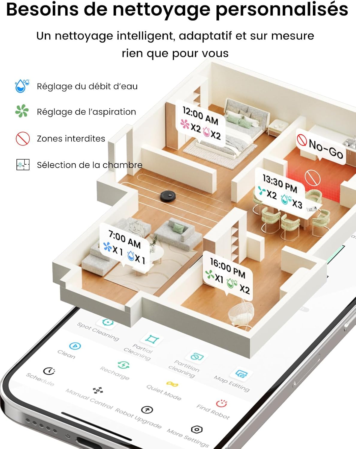 La présence d’un LiDAR 360° avec cartographie multi-étages compte ici bien plus que la serpillière. Pour l’acheteur, cela signifie un robot capable de nettoyer de manière ordonnée, de mémoriser les pièces, de gérer des zones ciblées et d’éviter le nettoyage aléatoire typique des modèles très bon marché. C’est souvent ce qui fait la différence entre un robot qu’on utilise vraiment et un robot qu’on finit par laisser de côté.
