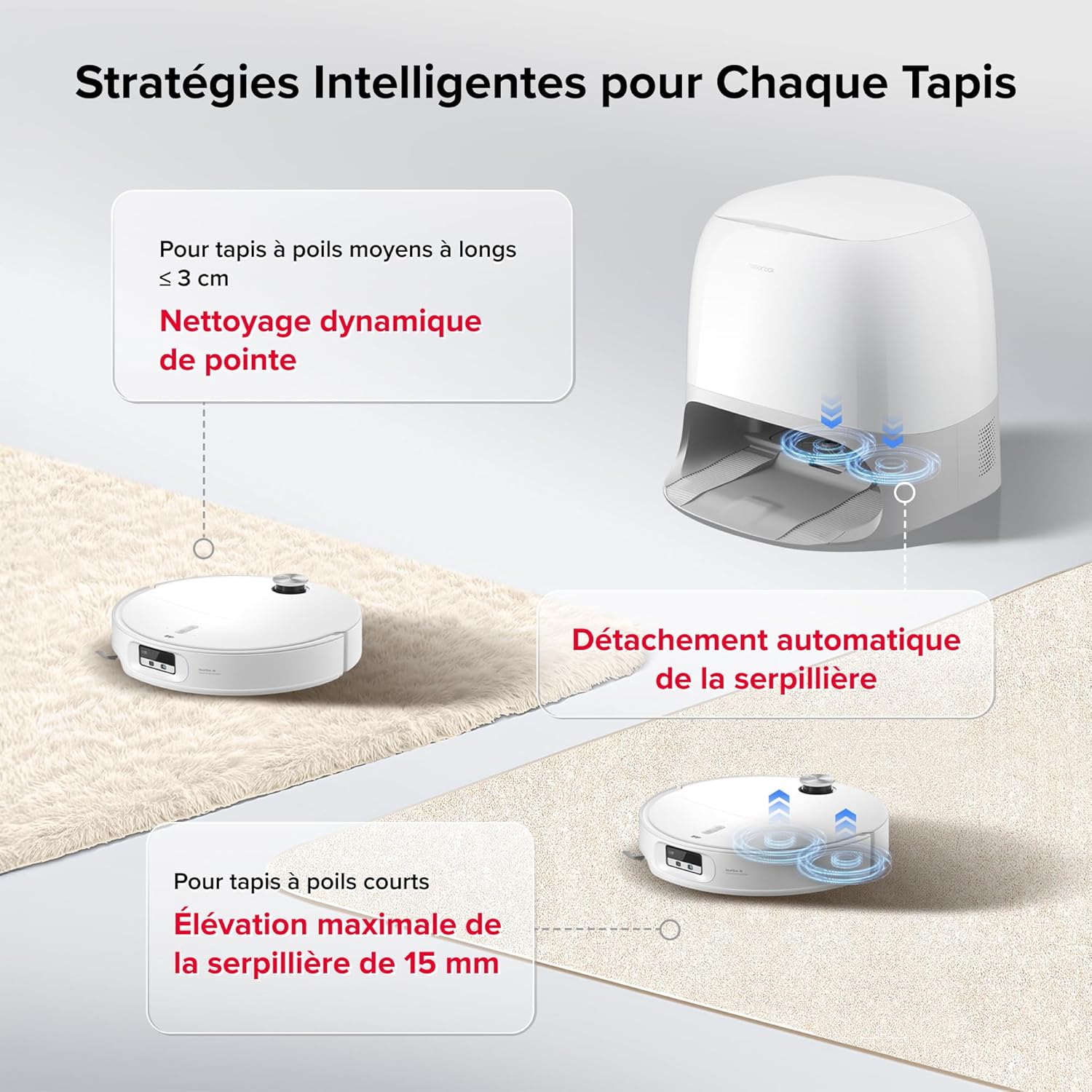 À 1 299 €, c’est important, parce que beaucoup de robots chers empilent des fonctions sans vraiment diminuer la charge mentale. Ici, la station a un intérêt concret. Le vidage automatique et le lavage/séchage des serpillières changent réellement l’usage quotidien si l’on lance le robot souvent. Le confort n’est pas décoratif : sans cela, la fonction laveur finit vite sous-utilisée. En revanche, la station n’annule pas l’entretien. Il faut toujours surveiller l’état des brosses, nettoyer ce qui s’accumule, gérer l’eau sale et accepter qu’une station sophistiquée ajoute aussi de la place occupée et davantage de complexité qu’un simple robot aspirateur.